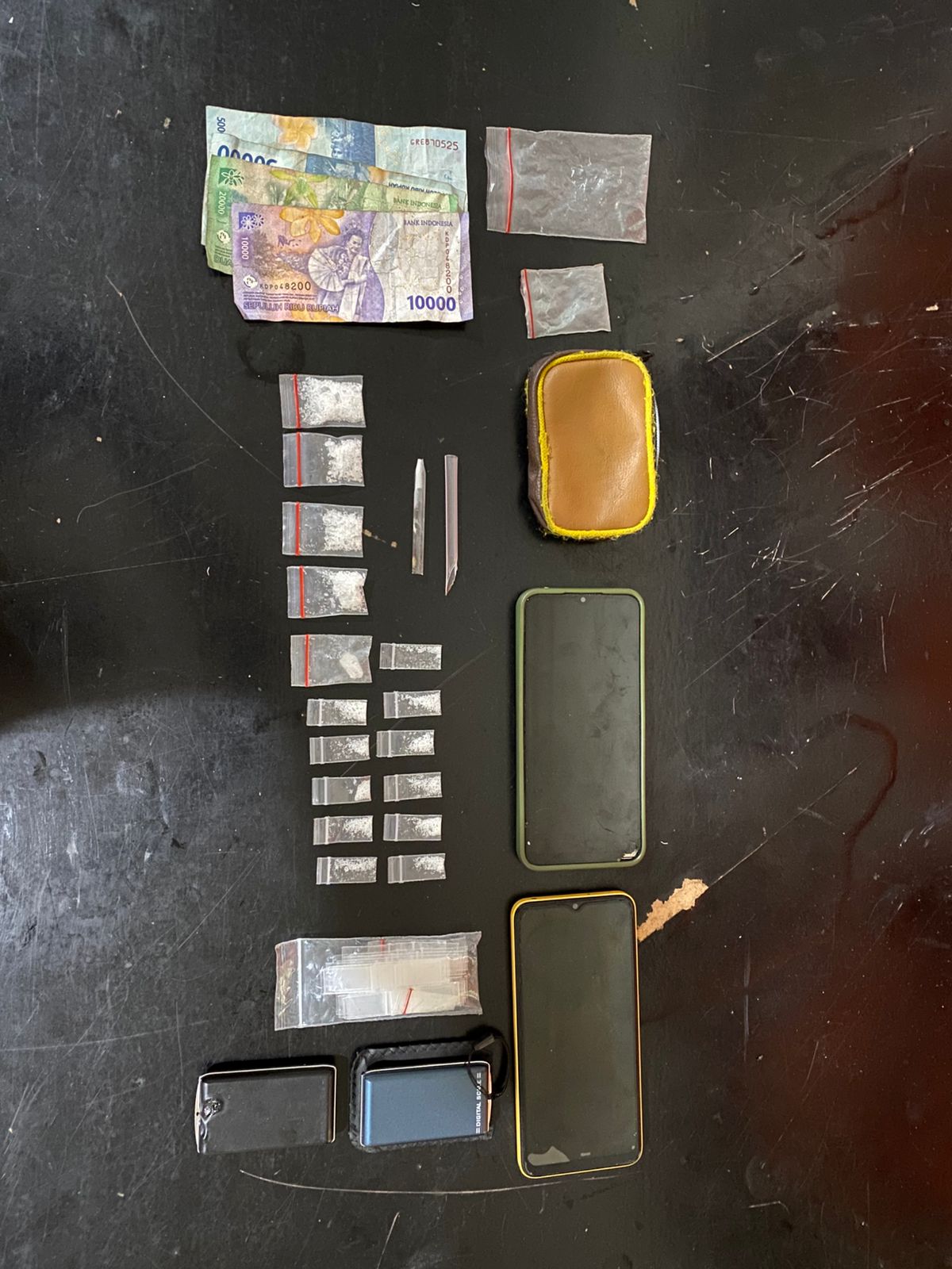 “Dari penggeledahan, kami mengamankan barang bukti berupa satu buah bong dari botol kaca yang masih berisi sisa bakaran sabu, delapan paket plastik klip berisi sabu dengan berbagai ukuran, dua unit timbangan elektronik merk pocket scale, sekop dari pipet plastik, kaca pirex, uang tunai Rp130.000, dan dua unit handphone. Total narkoba yang diamankan mencapai 8,12 gram bruto,” ungkap AKP Henry Salamat Sirait merinci barang bukti.