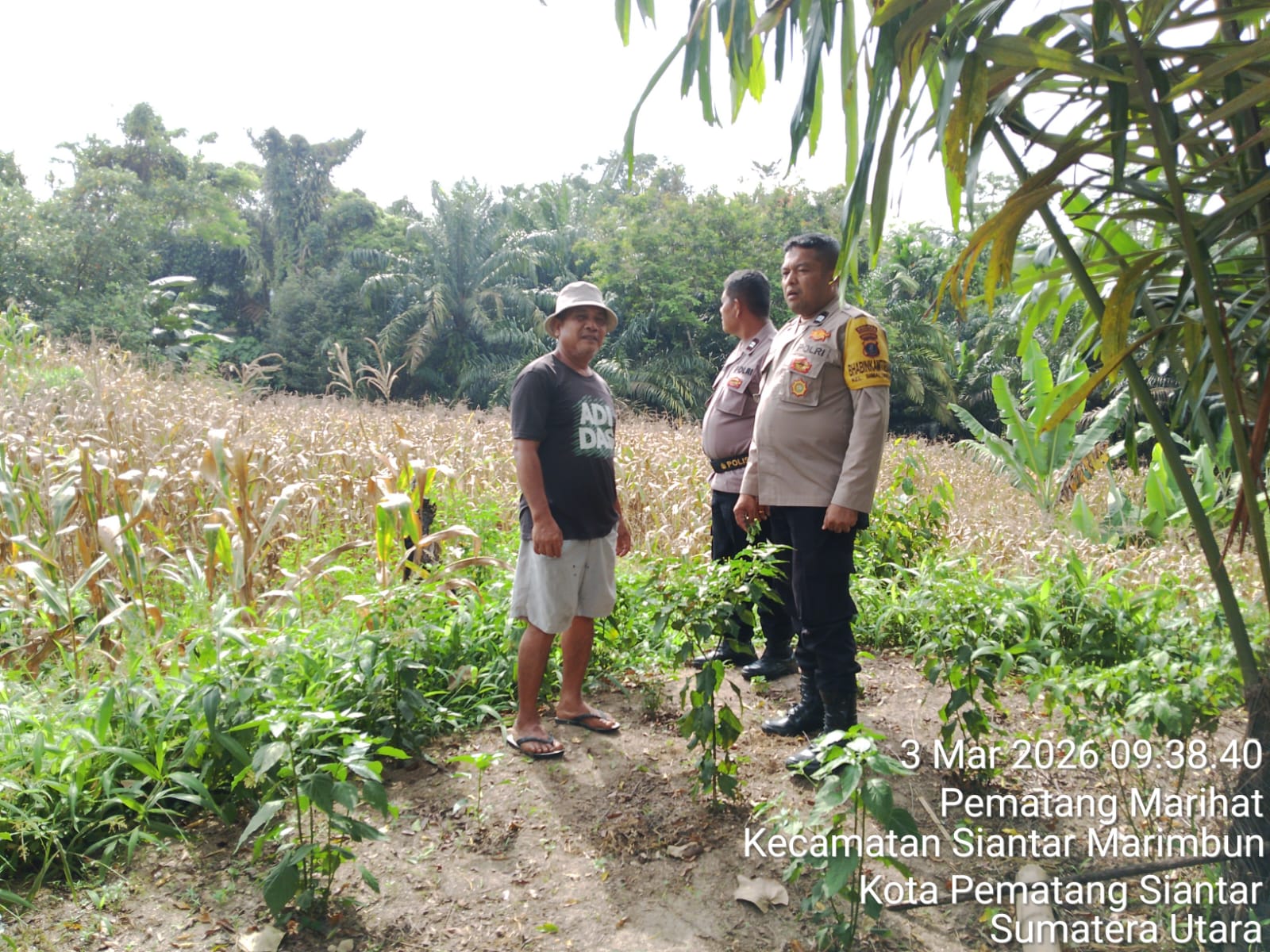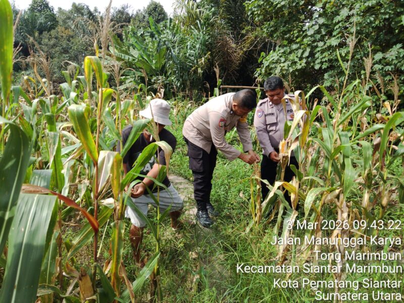 Liputanmetrosumut.com || Pematang Siantar – Dalam rangka mendukung Program Ketahanan Pangan (Ketapang), Polsek Siantar Selatan Polres Pematangsiantar melalui PS. Kanit Binmas AIPTU Panogaran Manurung bersama Bhabinkamtibmas Kelurahan Simalungun AIPTU Untung JF. Nainggolan dan Bhabinkamtibmas Kelurahan Kristen BRIPKA Swandi Hutabarat melaksanakan monitoring perkembangan tanaman jagung warga binaan Bapak Ramlan Panggabean di perladangan jalan Bahkora 2 Kelurahan Nagahuta Timur Kecamatan Siantar Marimbun Kota Pematangsiantar, Selasa 3 Maret 2026 pagi pukul 09:30 Wib.