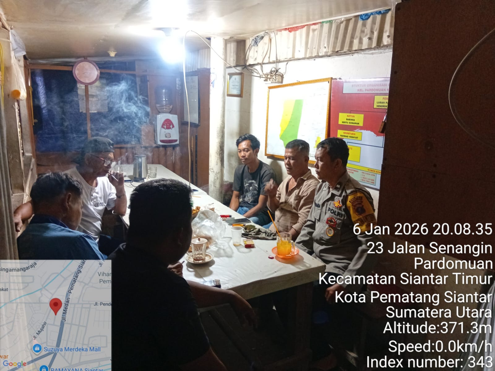 Liputanmetrosumut.com   ||  Pematang Siantar –       Bhabinkamtibmas Polsek Siantar Timur Polres Pematangsiantar, AIPDA Okto S. dan AIPDA G. Sinaga menggelar kegiatan Sapa Pos kamling atau Saling bertempat di Pos Kamling Jalan Senangin, Kelurahan Perdomuan Kecamatan Siantar Timur Kota Pematangsiantar, pada hari Selasa 6 Januari 2026 malam pukul : 20.15 WIB.