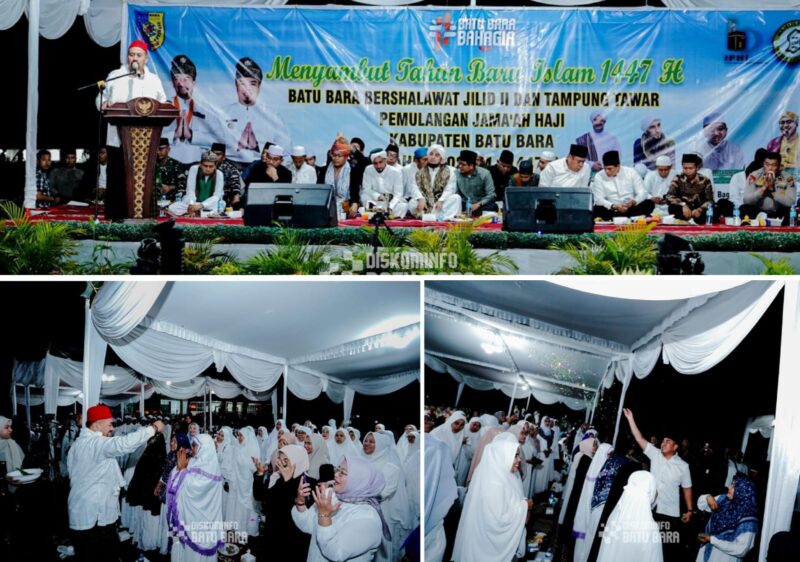 Liputanmetrosumut.com || Batu Bara – Dalam rangka menyambut Tahun Baru Islam 1447 Hijriyah, Pemerintah Kabupaten Batubara menggelar kegiatan penuh keberkahan dengan melangsungkan Tampung Tawar Haji dan Sholawat Bersama di Halaman Kantor Bupati Batu Bara, Kecamatan Limapuluh, Minggu malam (06/07/2025).