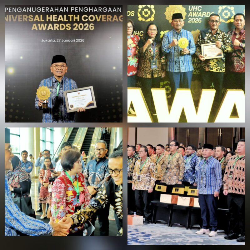 Penyerahan penghargaan berlangsung dalam acara Deklarasi dan Pencanangan UHC Tahun 2026, di Ballroom JIExpo Kemayoran, Jakarta Pusat, Selasa (27/1/2026). Pada acara tersebut, Menko PM didampingi oleh Menteri Kesehatan RI Budi Gunadi Sadikin, Wakil Menteri Dalam Negeri Bima Arya Sugiarto, serta Direktur Utama BPJS Kesehatan Prof. dr. Ali Ghufron Mukti.