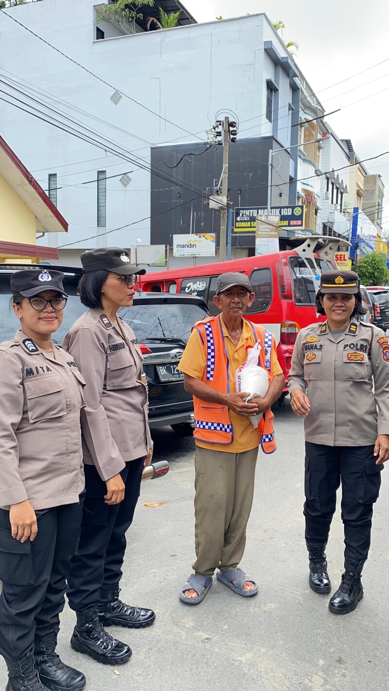 Kemudian Tim Patroli Srikandi Polwan sambangi sekaligus memberikan bantuan sembako kepada warga membutuhkan diantaranya juru parkir dan pedagang kaki lima (PKL).