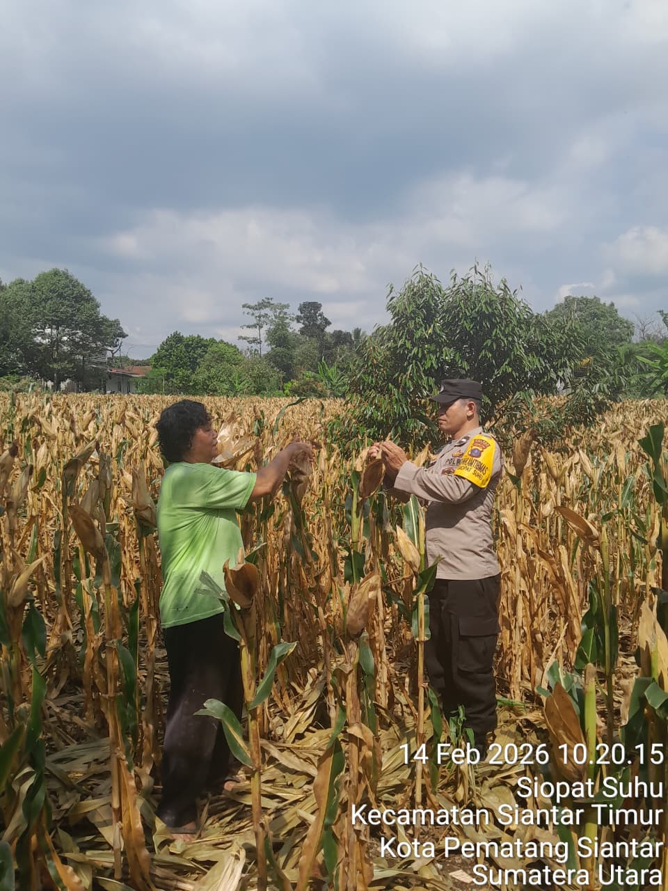 Liputanmetrosumut.com || Pematang Siantar – Polsek Siantar Timur Polres Pematangsiantar melalui Bhabinkamtibmas Kelurahan Siopat Suhu Aipda Vicktorson Saragih S.T sambangi ladang jagung warga binaan di Jalan Sangnawaluh Kompleks Asrama Putri Kampus Universitas HKBP Nommensen, Kelurahan Siopat Suhu Kecamatan Siantar Timru Kota Pematangsiantar, pada Sabtu 14 Februari 2026 pagi sekira pukul 10.20 WIB.