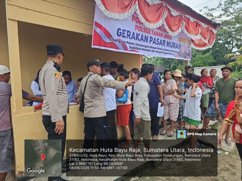 Liputanmetrosumut.com || Simalungun – Dalam upaya mendukung program stabilisasi pangan Presiden Prabowo Subianto, Polsek Tanah Jawa menggelar Gerakan Pasar Murah dengan menyalurkan 6 ton beras kepada masyarakat Kecamatan Hutabayuraja dan sekitarnya. Kegiatan yang berlangsung di Halaman Pos Polisi Hutabayuraja pada Kamis (4/9/2025) pukul 11.00 WIB hingga selesai ini merupakan wujud nyata sinergi Polres Simalungun dengan Bulog Cabang Pematang Siantar.