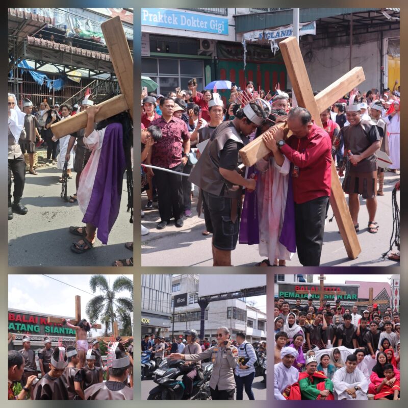 Tidak hanya melakukan pengamanan, Kapolres Pematangsiantar juga ikut ambil bagian dalam prosesi, termasuk dalam simbolisasi “pikul salib” serta penyerahan kain putih dengan gambar Yesus dalam rangkai jalan Salib, sebagai bentuk penghormatan dan toleransi terhadap pelaksanaan ibadah umat Kristiani.