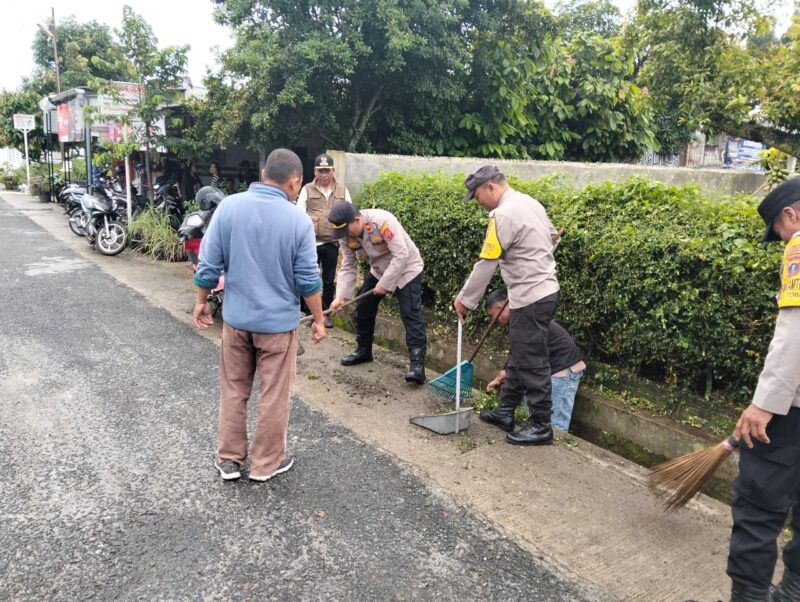 Liputanmetrosumut.com || Pematang Siantar – Kapolsek Siantar Selatan IPTU Priston Simbolon bersama personil mengikuti gotong royong di Jalan Marimbun Kelurahan Martimbang Kecamatan Siantar Selatan Kota Pematangsiantar tepatnya didepan Kantor Kelurahan Martimbang, Jumat 28 November 2025 pagi sekira pukul 08.00 Wib.