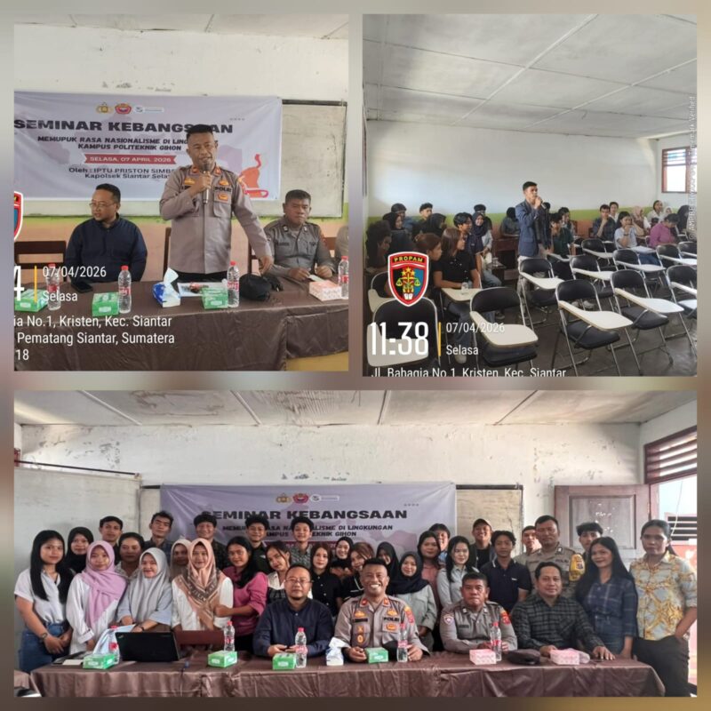 Liputanmetrosumut.com || Pematang Siantar – Kapolsek Siantar Selatan IPTU Priston Simbolon hadiri kegiatan Seminar Kebangsaan di Kampus Politehnik Gihon yang terletak di Jalan Bahagia Kelurahan Kristen Kecamatan Siantar Selatan Kota Pematangsiantar, pada Selasa 7 April 2026 siang sekira pukul : 1100.Wib.
