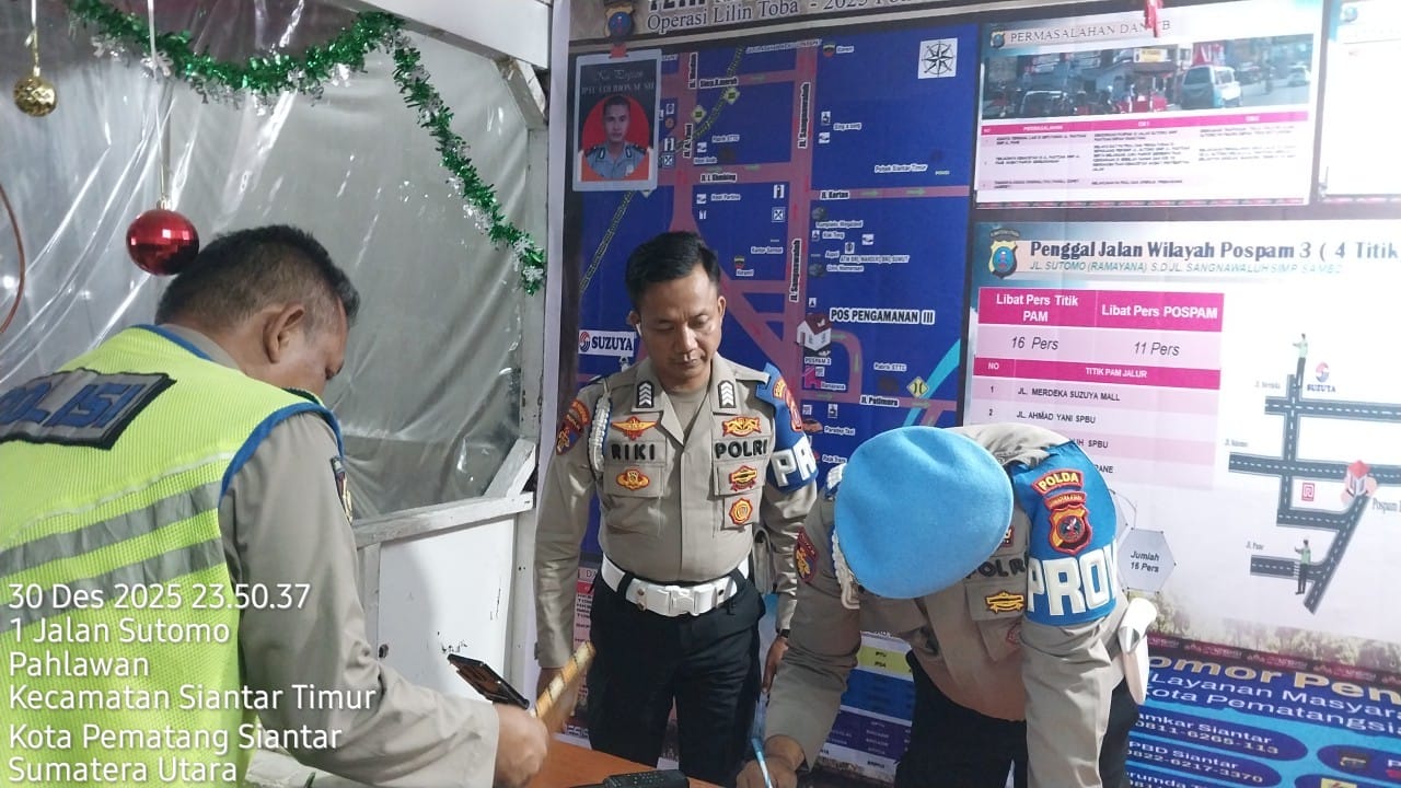 Liputanmetrosumut.com || Pematang Siantar – Kasi Propam Polres Pematangsiantar AKP Henry Palona Bangun, SH dampingi Tim Bidang Propam Polda Sumatera Utara (Sumut) melakukan pengecekan Pos Pengamanan (Pam) III Operasi Lilin Toba Tahun 2025 yang terletak di Jalan Sutomo – Jalan Pantoan Kelurahan Pahlawan Kecamatan Siantar Timur Kota Pematangsiantar, pada hari Selasa 30 Desember 2025 malam pukul : 23.50 Wib.