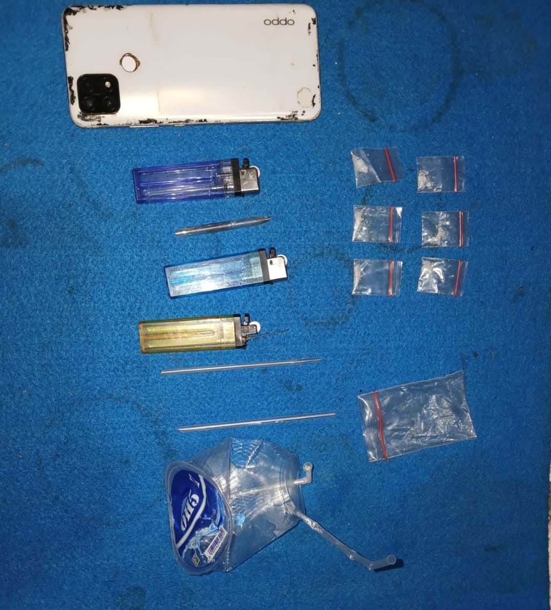 Selanjutnya disaksikan RT setempat, Tim Opsnal Sat Resnarkoba melakukan penggeledahan terhadap HG lalu ditemukan barang bukti dari lipatan celananya 1 buah plastik berisikan 6 paket diduga Narkotika jenis sabu, kemudian turut diamankan juga 1 buah bong lengkap dengan Pipet, 3 buah mancis dan 1 buah Pipa Kaca Pirex.
