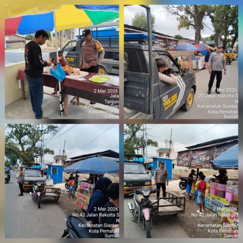 Liputanmetrosumut.com || Pematang Siantar – Polek Siantar Martoba Polres Pematangsiantar melalui Bhabinkamtibmas AIPTU J. Hutahuruk, AIPDA A. Malik dan AIPDA A. Simatupang melaksanakan patroli dan monitoring tempat penjualan takjil di wilayah hukum Polsek Siantar Martoba, pada hari Senin 2 Maret 2026 sore sekira pukul 16.30 Wib,