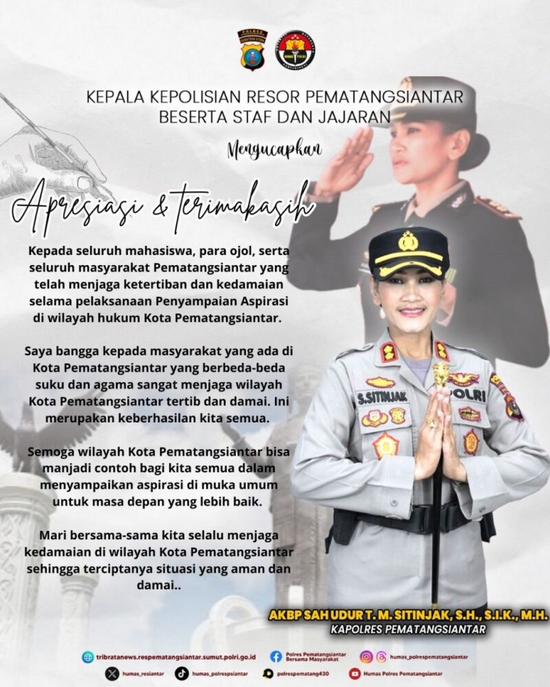 Liputanmetrosumut.com || Pematang Siantar – Aksi penyampaian beberapa aspirasi mahasiswa, ojek online (Ojol) dan masyarakat di Kantor DPRD Kota Pematang Sianțar berlangsung tertib dan damai pada hari Senin 1 Agustus 2025 kemarin di apresiasi Kapolres Pematangsiantar AKBP Sah Udur T.M. Sitinjak SH. SIK. MH.