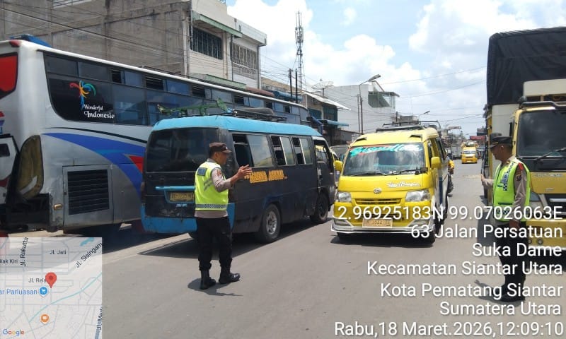 Liputanmetrosumut.com || Pematang Siantar – Polres Pematangsiantar melalui personil Pos Pengamanan (Pam) II Parluasan Operasi Ketupat Toba 2026 respon cepat melakukan penguraian kemacetan di Jalan Patuan Nagari Kelurahan Sukadame Kecamatan Siantar Utara Kota Pematangsiantr, tindaklanjut laporan masyarakat di Call Center 110, pada Rabu 18 Maret 2026 siang sekira pukul 12.07 Wib.