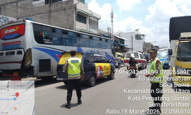 Liputanmetrosumut.com || Pematang Siantar – Polres Pematangsiantar melalui personil Pos Pengamanan (Pam) II Parluasan Operasi Ketupat Toba 2026 respon cepat melakukan penguraian kemacetan di Jalan Patuan Nagari Kelurahan Sukadame Kecamatan Siantar Utara Kota Pematangsiantr, tindaklanjut laporan masyarakat di Call Center 110, pada Rabu 18 Maret 2026 siang sekira pukul 12.07 Wib.