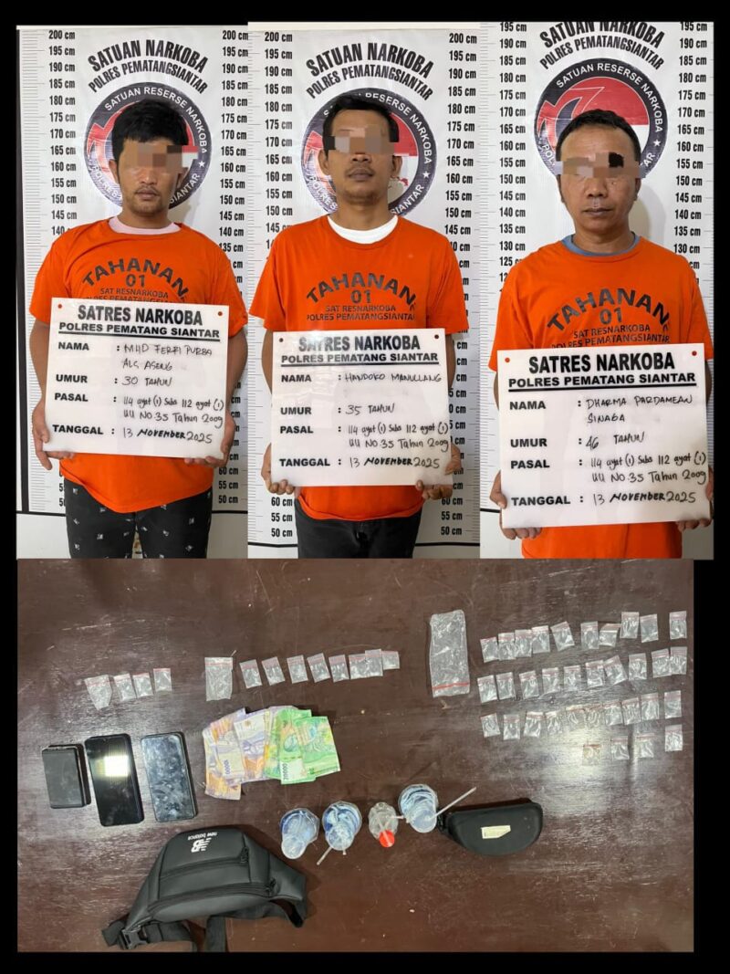 Kali ini, pada Kamis 13 November 2025 sekira pukul 13.30 WIB menangkap tiga (3) orang laki laki miliki narkotika jenis sabu berat bruto 18,1 gram di dalam rumah Jalan Sibatu-batu Gang Pulau Batu Kelurahan Bah Kapul Kecamatan Siantar Sitalasari Kota Pematangsiantar.