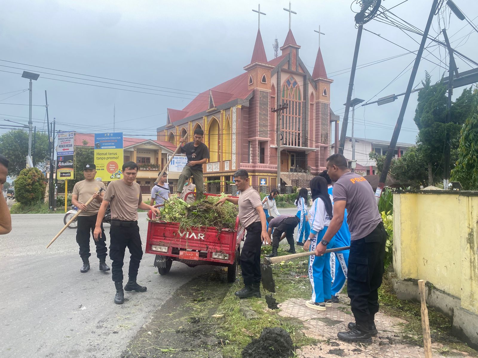 Kegiatan gotong royong tersebut berlangsung di depan Mako Polsek Siantar Utara, Jl. Patuan Nagari Kelurahan Sukadame Kecamatan Siantar Utara Kota Pematangsiantar.