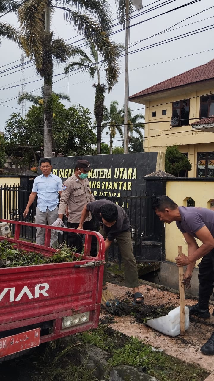 Kegiatan gotong royong tersebut berlangsung di depan Mako Polsek Siantar Utara, Jl. Patuan Nagari Kelurahan Sukadame Kecamatan Siantar Utara Kota Pematangsiantar.