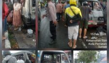 Liputanmetrosumut.com || Pematang Siantar – Personil piket Polsek Siantar Barat bersama SPKT dan Satuan Fungsi Polres Pematangsiantar respon cepat laporan masyarakat terjadinya kebakaran satu unit mobil Carry warna merah metalic 1219 FR di Jalan Sudirman Kelurahan Banjar Kecamatan Siantar Barat, pada Minggu (15/2/2026) sore sekira pukul 15.45 Wib.