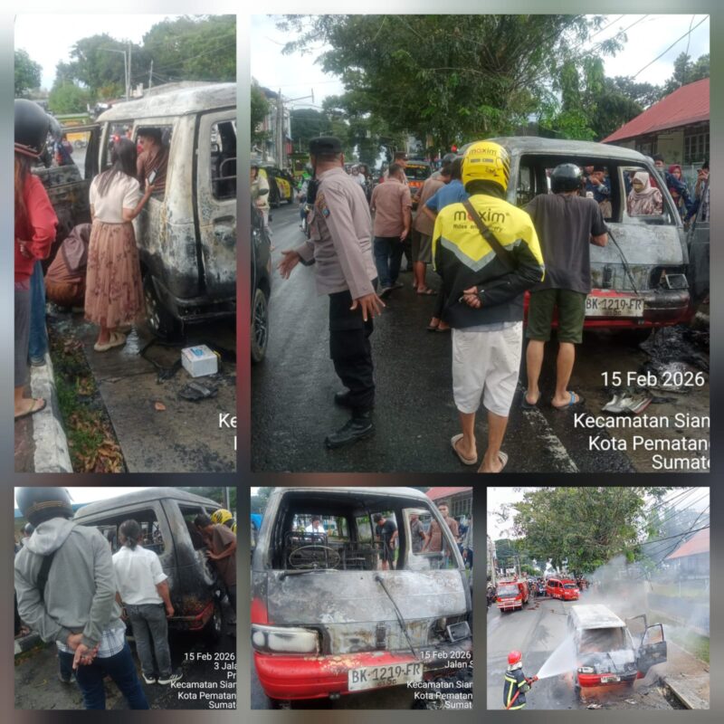 Liputanmetrosumut.com || Pematang Siantar – Personil piket Polsek Siantar Barat bersama SPKT dan Satuan Fungsi Polres Pematangsiantar respon cepat laporan masyarakat terjadinya kebakaran satu unit mobil Carry warna merah metalic 1219 FR di Jalan Sudirman Kelurahan Banjar Kecamatan Siantar Barat, pada Minggu (15/2/2026) sore sekira pukul 15.45 Wib.