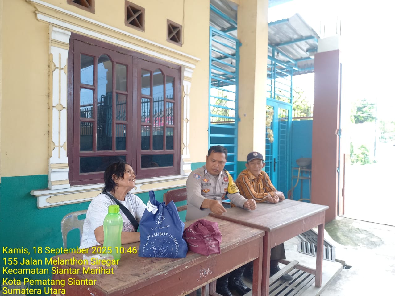 Liputanmetrosumut.com || Pematang Siantar – Polsek Siantar Marihat Polres Pematangsiantar melalui Bhabinkamtibmas Kelurahan Parhorasan Nauli melaksanakan sambang kepada masyarakat Jalan Melanthon Siregar, Kelurahan Parhorasan Nauli, Kecamatan Siantar Marihat, Kota Pematangsiantar, pada Kamis 18 September 2025 pagi pukul : 10.30 Wib.