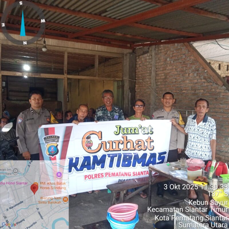 Liputanmetrosumut.com || Pematang Siantar – Polsek Siantar Timur, Polres Pematangsiantar melalui Perwira pengawas (Pawas) IPDA Todo Tamba bersama piket Bhabinkamtibmas Aiptu Ungkap Hutagalung dan Bripka Manoa Sitanggang menggelar kegiatan Jumat Curhat Kamtibmas kepada masyarakat Jalan Narumonda Bawah Kelurahan Kebun Sayur Kecamatan Siantar Timur Kota Pematangsiantar bertempat di warung kopi Pak Sihar Sinaga, pada Jumat 3 Oktober 2025 siang pukul : 11.15 WIB.