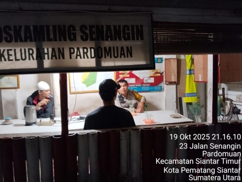Liputanmetrosumut.com || Pematang Siantar – Polsek Siantar Timu Polres Pematangsiantar melalui Piket Bhabinkamtibmas AIPDA Okto Sihole dan AIPDA G. Sinaga menggelar kegiatan SALING (Sapa Siskamling) di Pos Kamling Jalan Senangin, Kelurahan Pardomuan, Kecamatan Siantar Timur, Kota Pematangsiantar, pada hari Minggu 19 Oktober 2025 malam sekira pukul : 21.16 Wib.