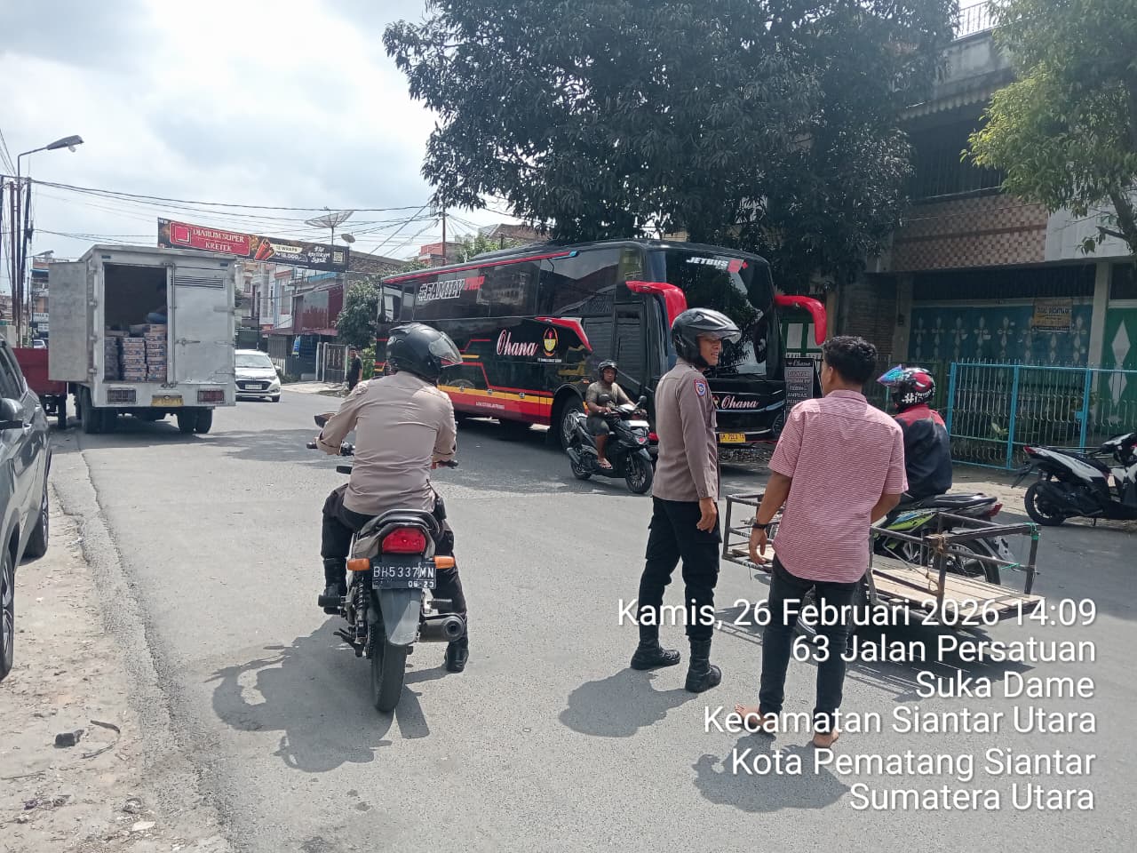 Liputanmetrosumut.com || Pematang Siantar – Polres Pematangsiantar melalui personil piket Polsek Siantar Utara respon cepat tindaklanjuti laporan Call Center 110 dengan melakukan pengaturan arus lalu lintas (Gatur Lalin) mengantisipasi kemacetan di Jalan Persatuan Kelurahan Sukadame Kecamatan Siantar Utara Kota Pematangsiantar, pada Kamis 26 Februari 2026 siang sekira pukul 13.45 Wib.