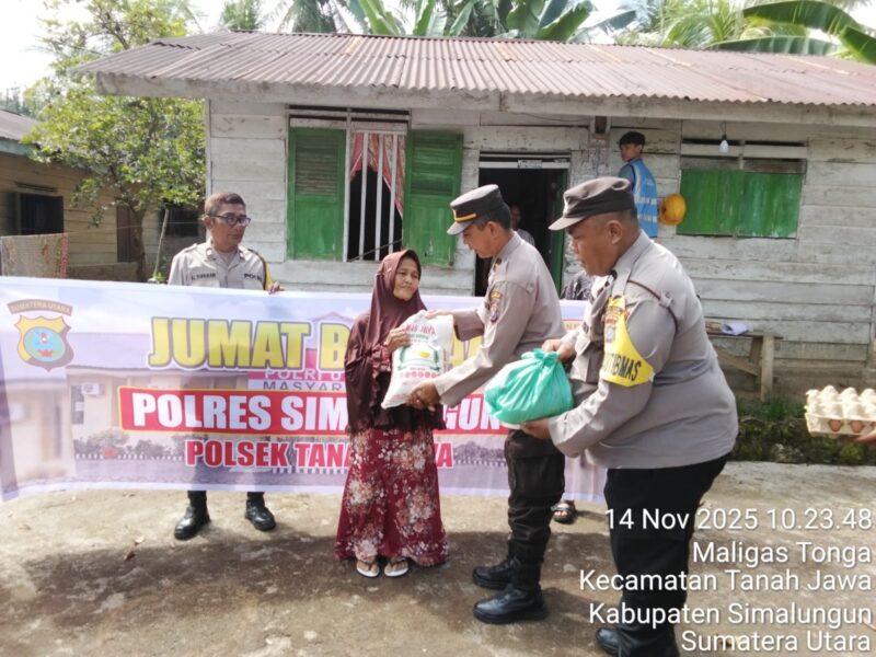 Liputanmetrosumut.com || Simalungun – Kapolsek Tanah Jawa KOMPOL Asmon Bufitra, S.H., M.H., yang diwakili oleh Panit Samapta Ipda Abar Manik bersama jajaran personil Polsek Tanah Jawa melaksanakan kegiatan Jumat Berkah dengan menyalurkan paket sembako kepada warga kurang mampu di Huta I Maligas Tonga, Kecamatan Tanah Jawa, Kabupaten Simalungun, pada hari Jumat, 14 November 2025, mulai pukul 09.00 WIB hingga selesai.