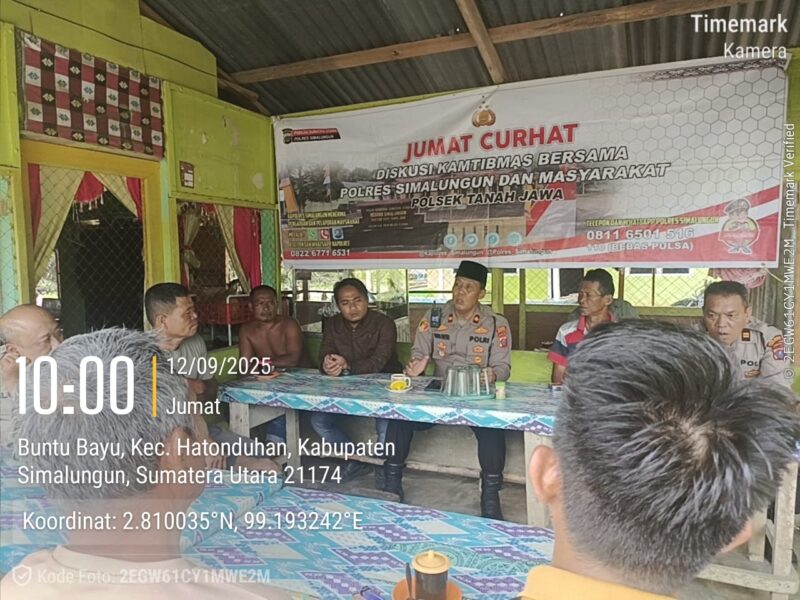 Liputanmetrosumut.com   ||  Simalungun – Dalam upaya memperkuat hubungan emosional dan komunikasi dengan masyarakat, Polsek Tanah Jawa Polres Simalungun menggelar program inovatif “Jumat Curhat” di warung kopi milik Ibu Suyanti, Huta IV Jampalan Nagori Buntu Bayu, Kecamatan Hatonduhan, Kabupaten Simalungun, pada Jumat (29/8/2025).