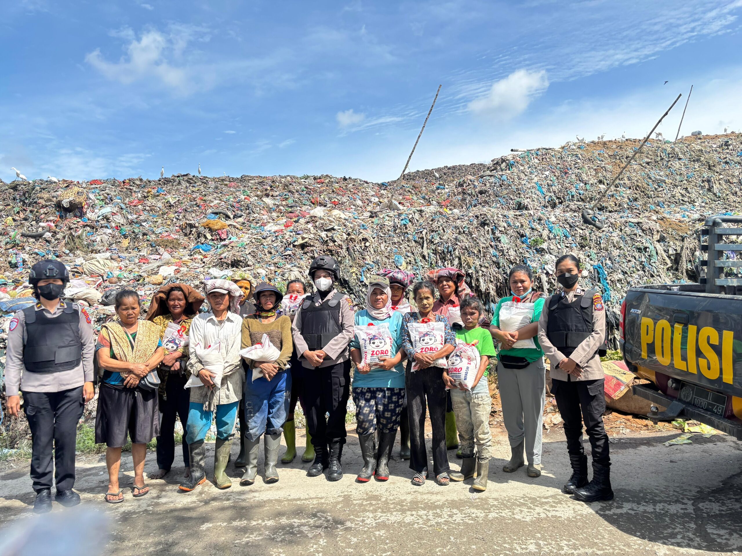 Kemudian IPDA Serly Tarigan bersama Tim Patroli Srikandi Polwan membagikan bantuan sembako berupa beras 5 Kg kepada masyarakat bekerja pemulung di wilayah TPA (Tempat Pembuangan Akhir) Tanjung Pinggir sembari memberikan himbauan antisipasi gangguan Kamtibmas.
