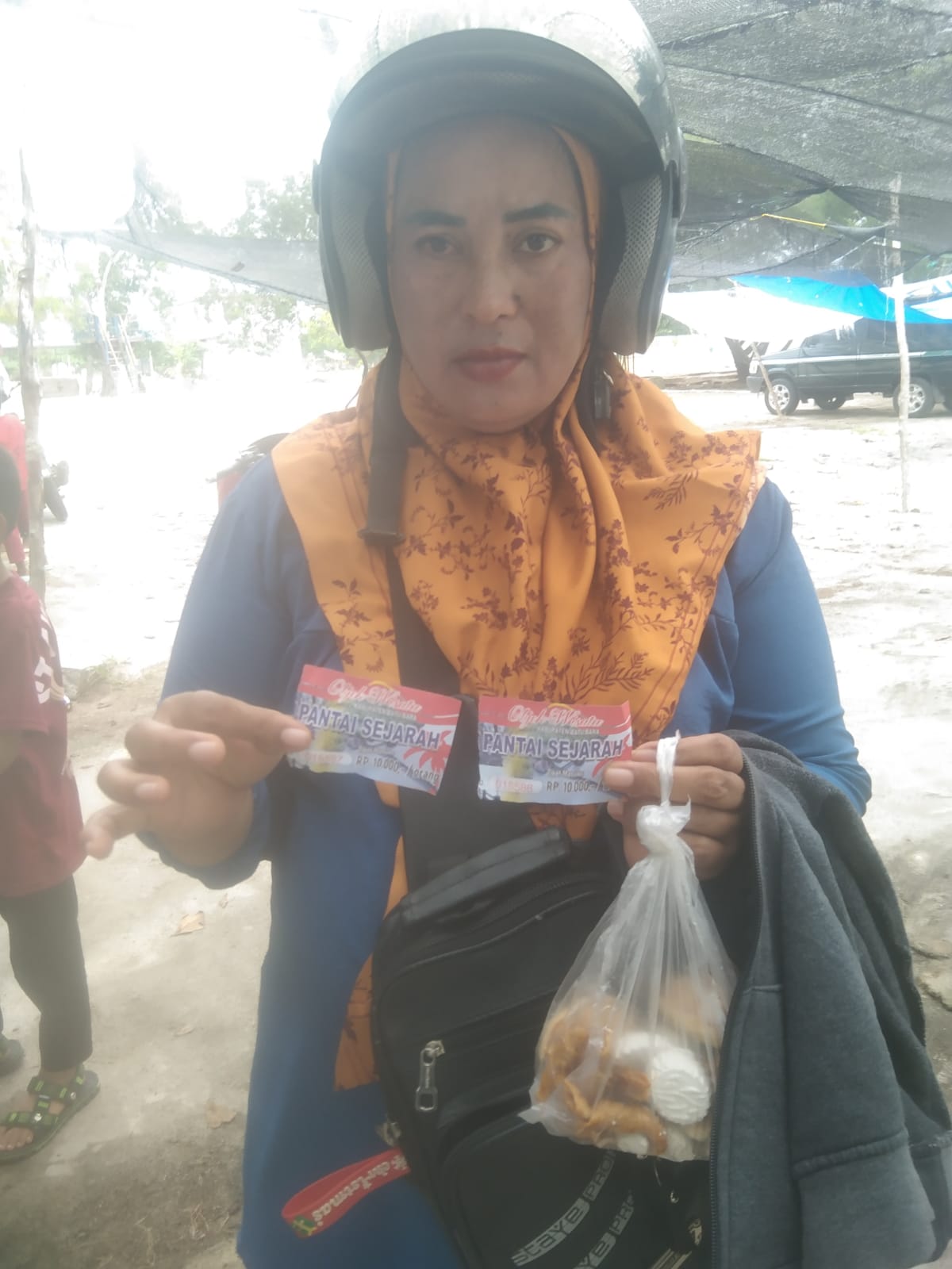 Foto : Ibu-ibu Memegang TIket Masuk Yang di Gunakan di Kawasan Wisata Pantai Sejarah.
